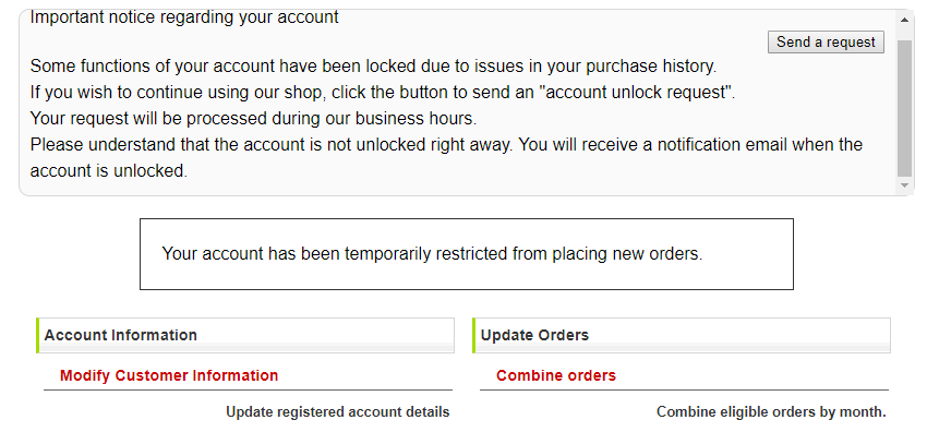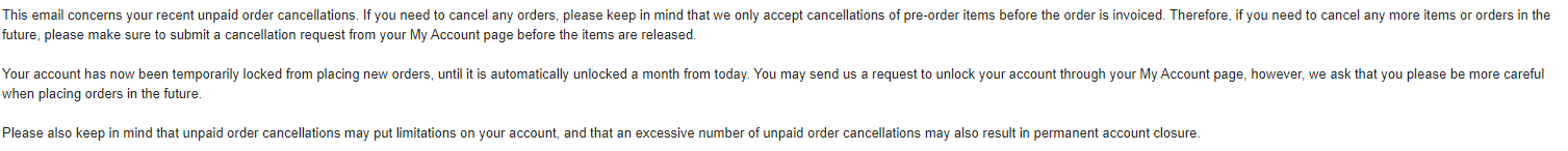 Хмм.. Ами похоже стали лояльнее относиться к неоплаченным предзаказам. Сегодня отменился заказ, который я тут >>44922 хотел отдать (забавно, что мне дали не неделю на оплату, а 5 дней). Вот письмо, которое они мне прислали и вот что висит у меня на аккаунте. Если коротко, то аккаунт заблокирован на месяц, заказывать я на нём пока что не могу, но можно ПОПРОСИТЬ его разблокировать, лол. Ещё написали, что если надо что-то отменить, то "плокс делай это до релиза". В последнем предложении пишут, что именно НЕОПЛАЧЕННЫЕ заказы могут стать причиной ограничений и бана. Получается просить отменить заранее можно сколько угодно?