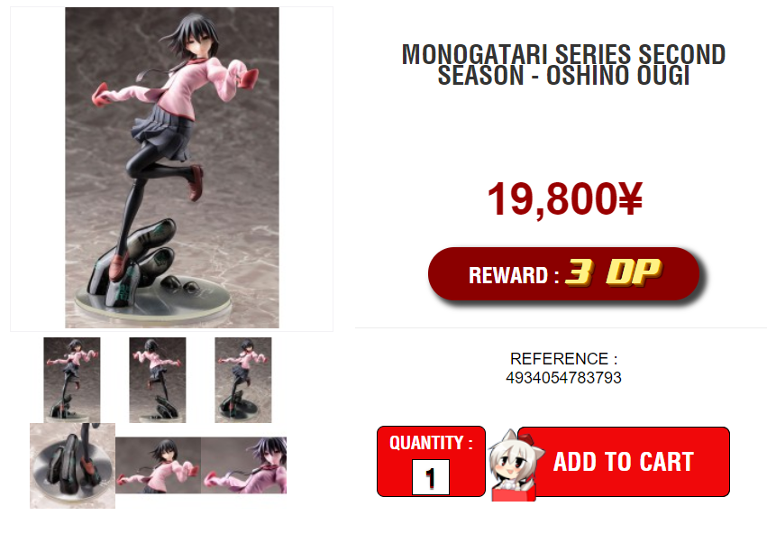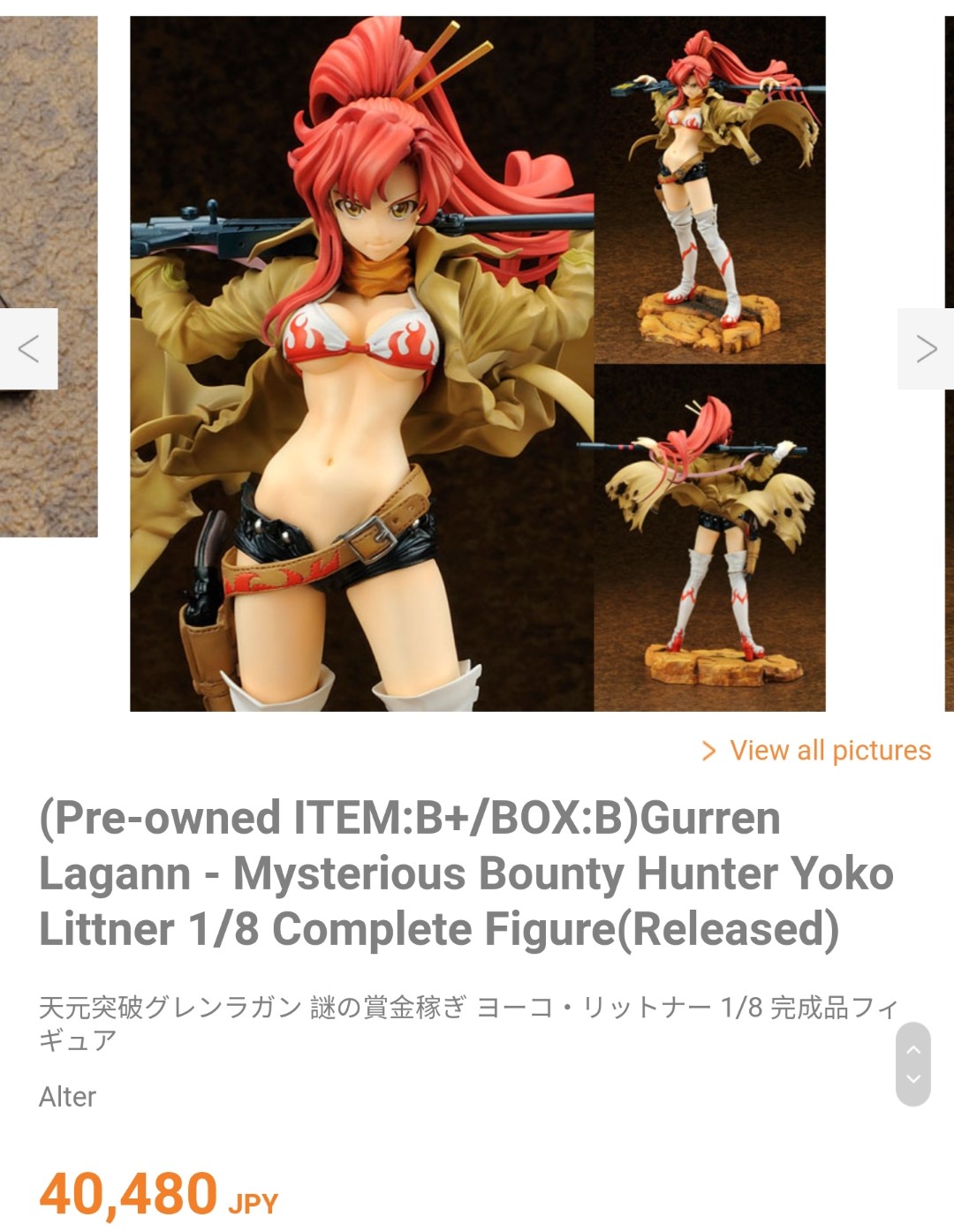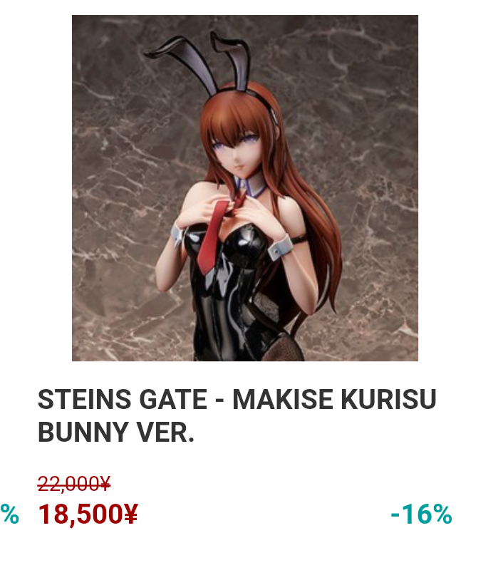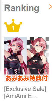 >>45263 Где-то (на анимешелфе, видимо) я его в списке рекомендуемых магазинов видел, значит, кто-то покупает. Но я, конечно, с трудом представляю себе, какой человек может купить за 4000 рублей жалкий прайз, которому цена 600-800 иен в идеальном состоянии.