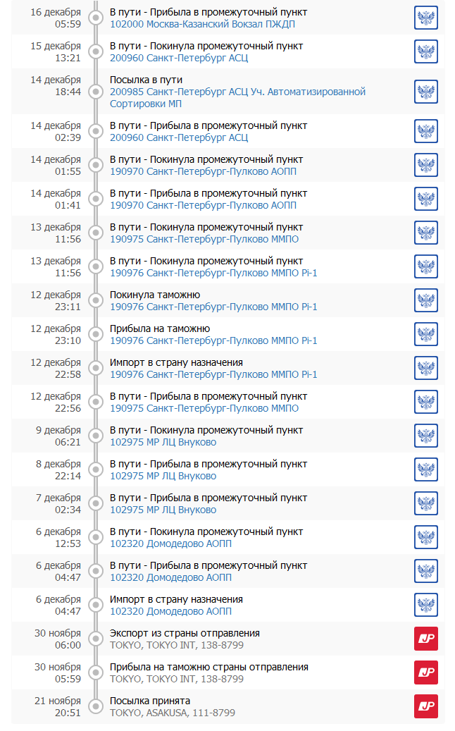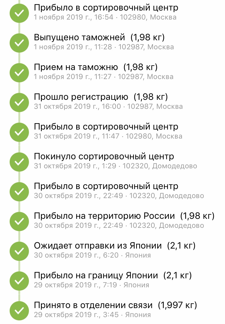 >>45484 Всегда сам забираю. Во 1ых - как и сказал >>45485 курьеры тормоза Во 2ых - у меня пункт выдачи емс это отдельное отделение причем совмещённое с последним сортировочным центром, поэтому могу забирать когда статус еще только "прибыло в сортировочный центр г. Подзалупинска". Посылка идет 7-8 дней обычно из японии. 4 дня до москвы и 3 дня до меня.