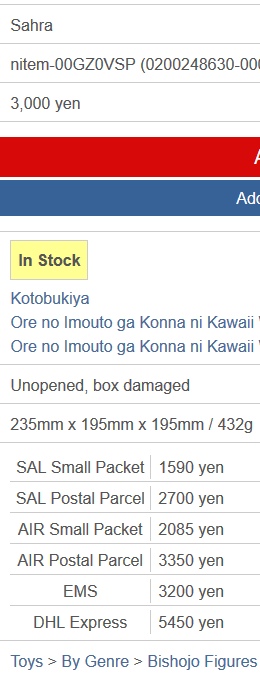 >>45231 Написал амико, пидоры ответили, что размер коробки 430x317x296, и это сука при том что фигурка 27x24x23. Жопа горит, больно отдавать больше половины цены фигурки за доставку.