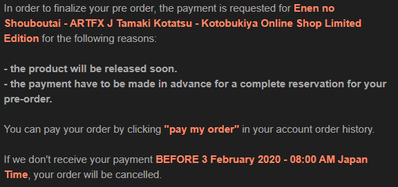 >>48430 Если ты оплатил, то уже никто не тронет. Вообще, фигурка будет лежать в твоей коробке на складе, пока ты явно не дашь понять, что заказ нужно расформировать.