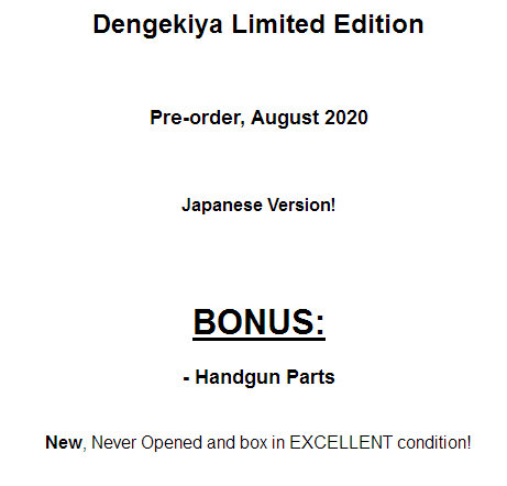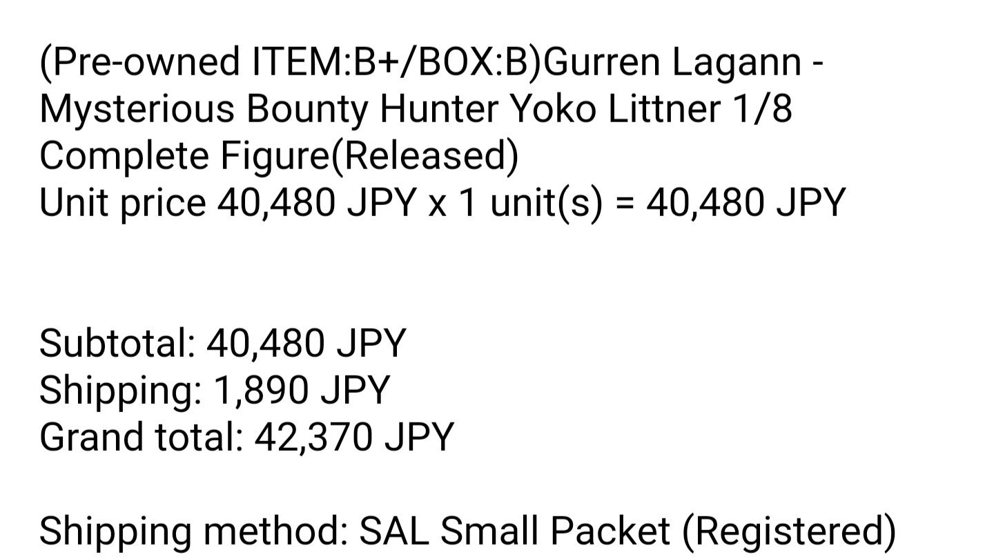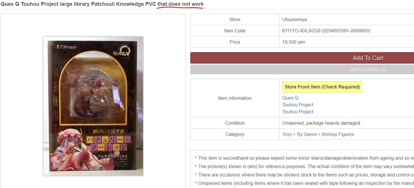 >>45406 >-Condition Rank of the products. >A: Item is sealed and is unopened or appears to be unopened. >A-: Item is not sealed but appears to be unopened. >B+: Item has been opened but no damage is visible. All bundled items are included. >B: Item has been opened and minor dirt or damage is visible. All bundled items are included. >C: Opened item with conspicuous damage. Sub parts may be missing. >J: Main item or main parts are missing, severely damaged, and/or having problem with operation.