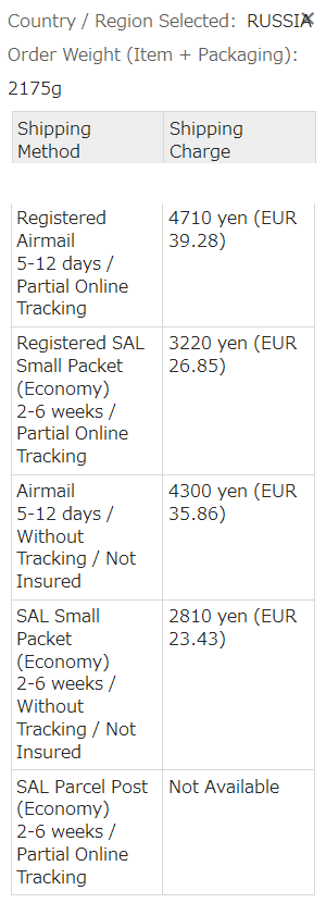 >>48366 Китай отправляет. А вот почта Японии, когда последний раз 10-го числа обновляла инфу, указывала, что в Россию не отправляют Airmail и EMS, а SAL прекратили вообще для всех стран.