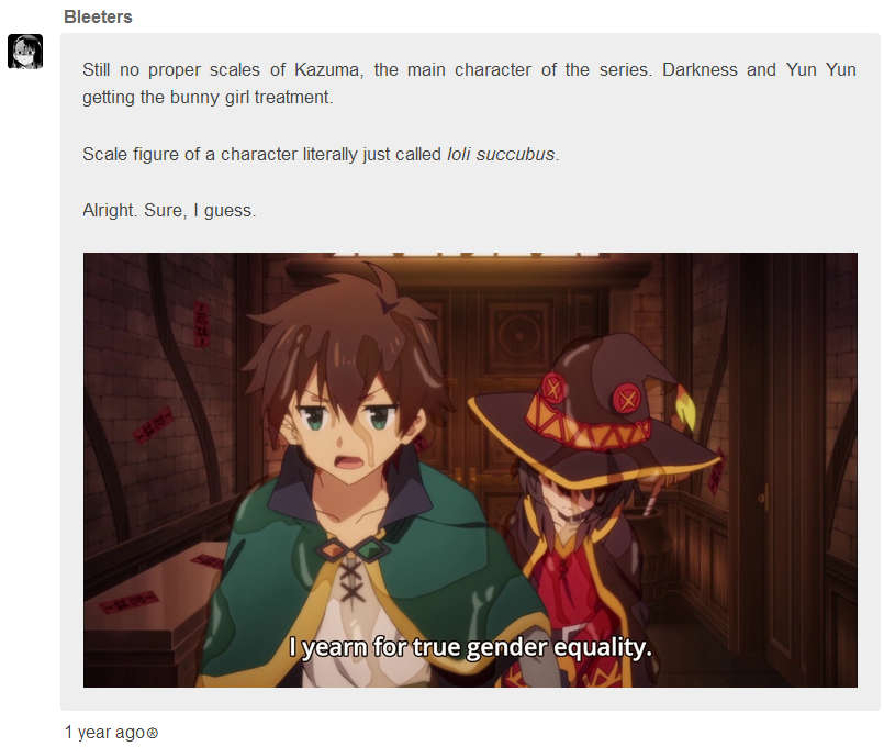 >>48364 О да, лоля суккуб оооочень популярный персонаж Коносубы. Там в коментах питафайлы ругаются на слишком большие сиськи. >>48360 Я заказывал фигурку с релизом через полгода. Через полгода релиз перенесли на полгода. Через полгода еще несколько переносов. Итого, спустя полтора года я её купил, но совсем без удовольствия.