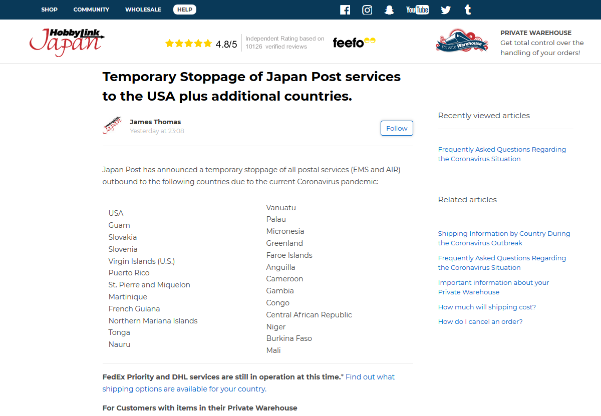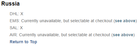 >>48463 Как вы себе представляете, чтобы ни один магазин не отправлял тем же САЛом, а Ами, например - отправлял? Не отправляет почта Японии, которая указала, что для России сейчас не отправляет Airmail/EMS, а САЛ вообще не работает пока для всех стран.