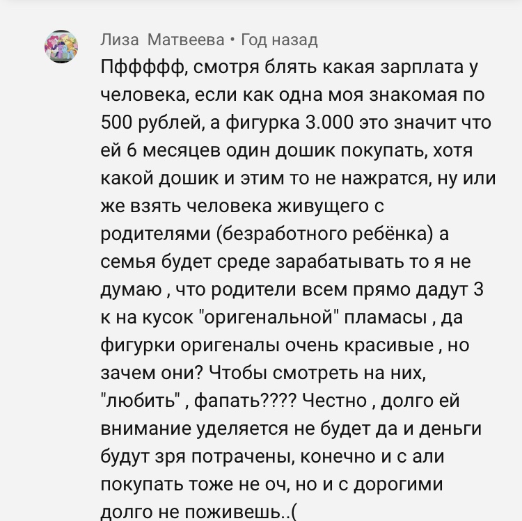 >>46100 Сын депутатши ну не траль. Для школьника 12к не самая маленькая сумма, а если выйти за дс то тем более. К тому же вокруг слишком много других соблазнов на потреблядства или хобби, никто из обычных пиздюков не станет месяц-другой-третий воздерживаться ради аутентичной полимерной девочки. Понять это легко, особенно если не выебываться доходами, но оправдывать никак. То что > Аниме коммунити вообще в РФ мусорное это увы так, адекватов не разглядеть позади социоблядей для которых это просто модный тренд. Также к их нищебродству еще идет бонусом любовь к наебу системы и они часто верят в то что делают. > ЧТо там можно сделать на 800 рублей? Так купи и сделай треш обзор заодно с разборкой. Меня самого гложет любопытство но не хочется огорчаться от вида паршивой эксплуатации образа. жан_очка за 39к, это типа дохуя редкая?