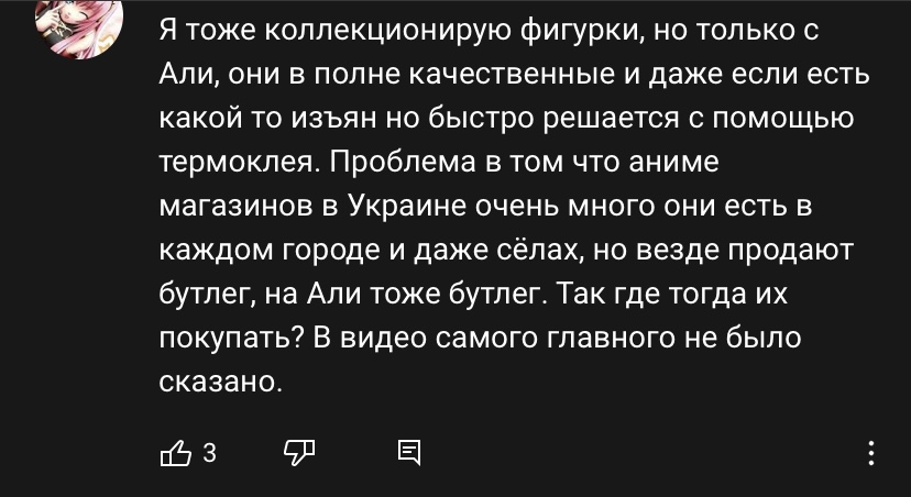 Ну или да, просто признайся, что имеешь специфическое хобби. Правильно вот анон выше отметил: >>45936 >Они коллекционеры бутлегов. Хобби общее, но комьюнити разное. >С ними даже поговорить не о чем. Фигурок, которые я хотя бы гипотетически могу признать объектом коллекционирования, у них никогда не будет. Тоже не понимаю смысл бугурта. Некоторые, вон, по помойкам лазают в /diy/. Кто-то бутлеги коллекционирует - каждому своё. Не то, чтобы я это понимал, но это точно не повод для бугурта или для вербовки людей из другого лагеря к себе.