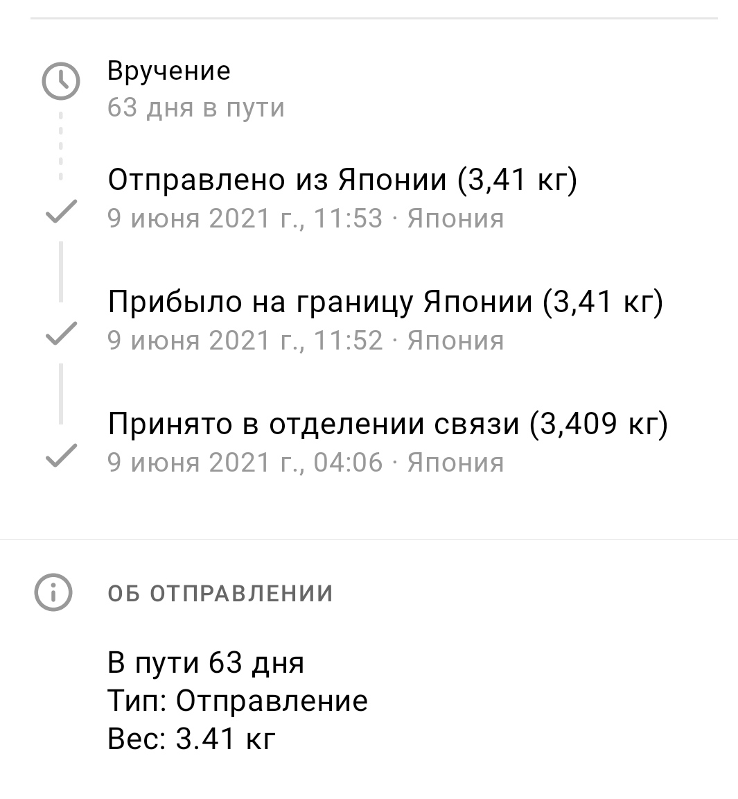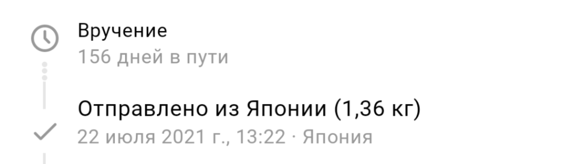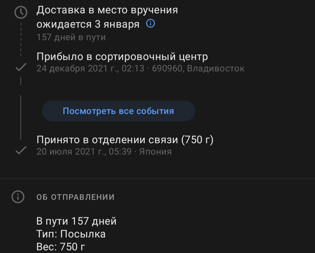 Сегодня выскочило уведомление в приложухе, что посылка поступила на сортировку, захожу в приложуху, а там все так же "Отправлено из Японии" и 86 дней в пути. Проверил трек на сайтах, тоже дальше отправления не прошла посылка.