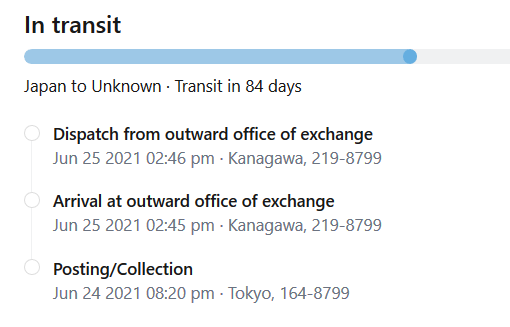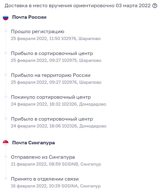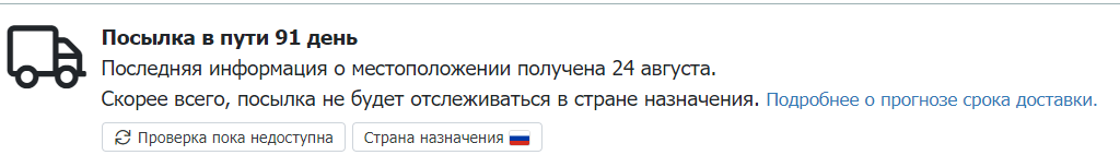 Только что заметил что у меня на одном отправлении, которое не трекается уже почти три месяца, помечено destination - unknown. Так ведь не должно быть, да? Не знаю, было ли всегда так или только стало позже, но теперь уже сомневаюсь что посылка доедет. Жаль, а то было интересно что мне там послали - ведь моего реального заказа там быть не могло, магазин с какого-то лешего выложил всё содержимое моего оплаченного заказа обратно на продажу и его почти сразу раскупили другие. Из-за этого казуса здаётся мне что посыла была заведомо отправлена в неопределённую локацию с целью потеряться, так они переложат вину с себя на почтовиков.