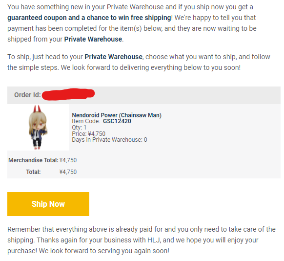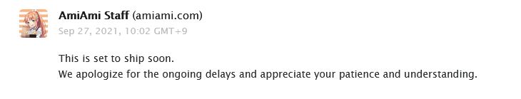 >Thank you for shopping at AmiAmi. >Due to the large number of shipments to be processed at the moment shipments may take more than 14 business days after payment to be shipped out. >Please note that Sundays and national holidays (September 20th and September 23rd) are not considered business days. >We have confirmed your payment on September 3rd, and your shipment is scheduled for shipment on September 28th.