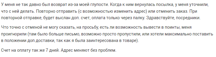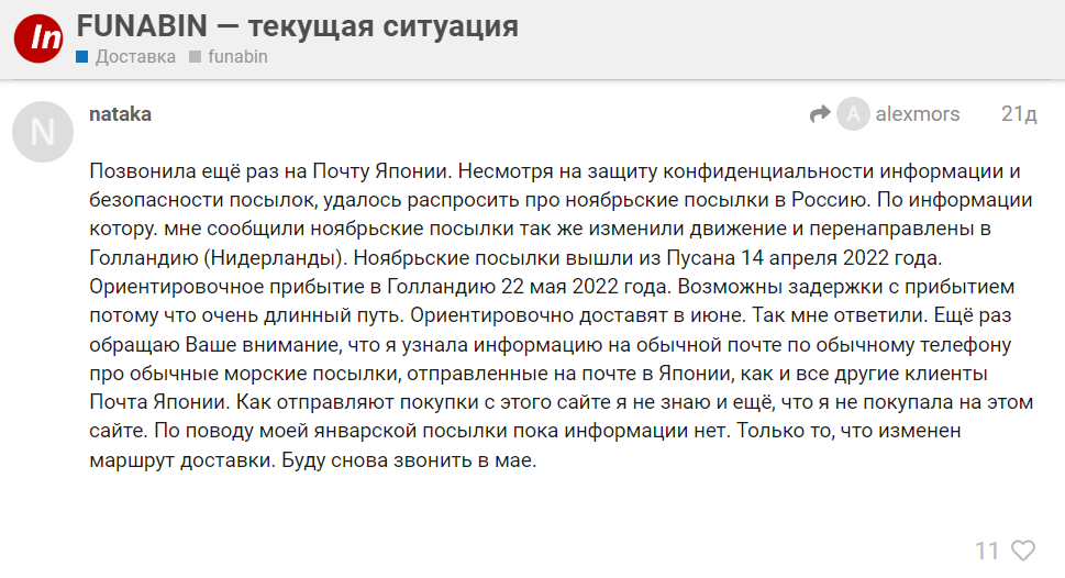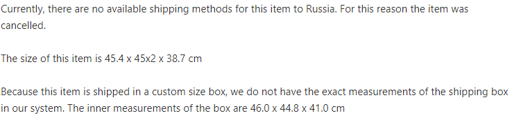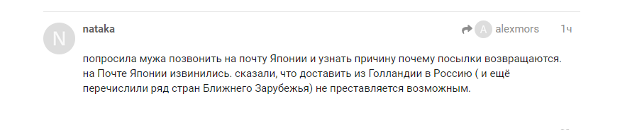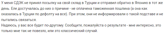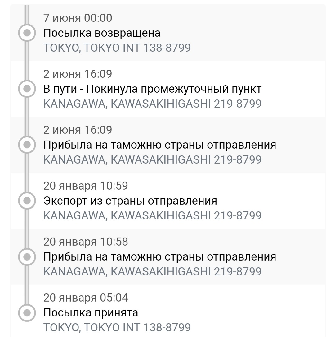 >>54818 Моя посылка за начало декабря была отправлена взад в Японию, получили ее в июне судя по треку. В Саппорт Ами писал в июле, сказали еще не дошли до моей посылки, ожидайте. 27 сентября таки написали о возврате, отправил на склад Боксберри, уже приехала к ним коробка, жду счета на доставку.