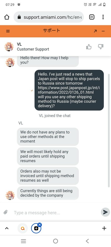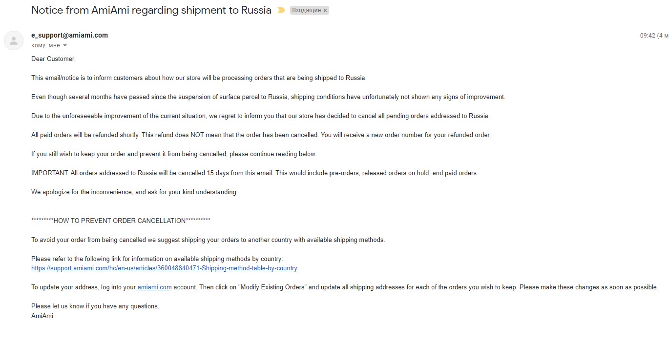 >>53019 >Ами до сих пор не выставили счёт Они в последнее время очень долго выставляют счет и еще дольше отсылают. Так что морально готовься что июльский предзаказ отправят в сентябре. >Ещё и посылка одна едет в РФ уже 75 дней. Японская почта писала что там у них какие-то проблемы на их стороне и что из-за этого задержки.