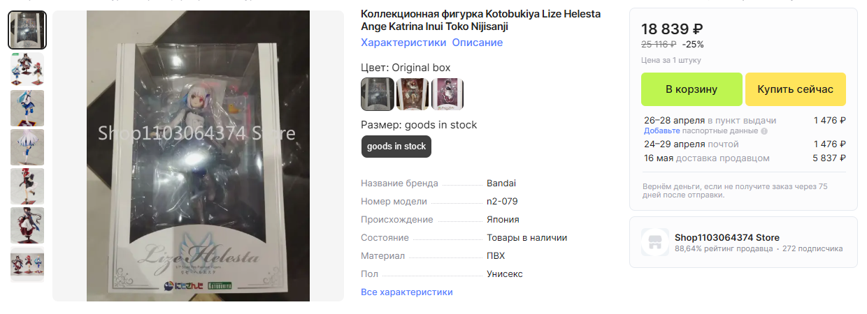 >>62591 >Сап, аноны. Помогите новичку вкатиться в коллекционирование фигурок. Отзывы чекай. если доставка из-за рубежа, лучше не заморачиваться если хочешь потом в случае чего вернуть товар. хуита полнаяпо слухам если местный, 7-14 дней по любой хуйне вернешь. пик отзыв из одного твоего магаза. думой сам.