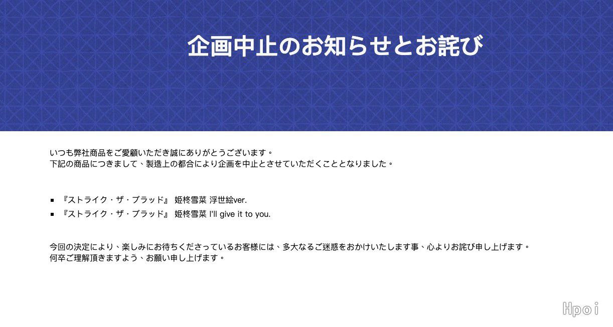 SOL International объявили об отмене выпуска фигурки Tachibana Hibiki X-Drive Ver из Senki Zesshou Symphogear GX У фигурки даже не показали прототип. Ранее они же отменили выход фигурок Albedo и Power - они уже имени цветной прототип. Последняя вышедшая в релиз фигурка от них это Holcid, она вышла в сентябре 2024. После этого у компании не было новых анонсов.
