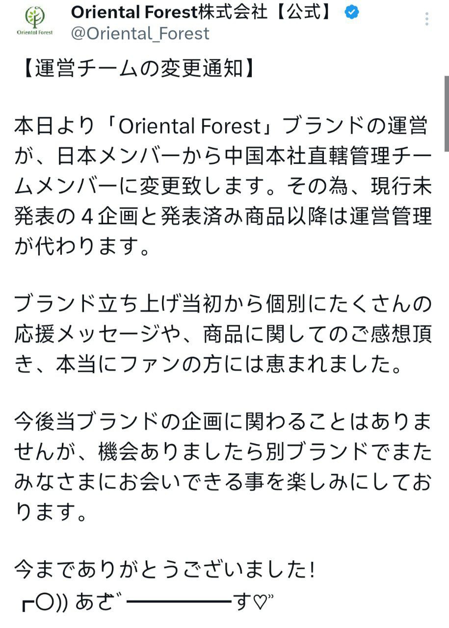 Недавно производитель Oriental Forest опубликовали такой пост. В нем они говорят что передают управление брендом китайскому подразделению, а японское прекращает свою работу. Так же сказано что они полностью передают права на 4 пока неанонсипованных проекта им и всю работу над проектами которые на данный момент в предзаказе или на стадии производства.