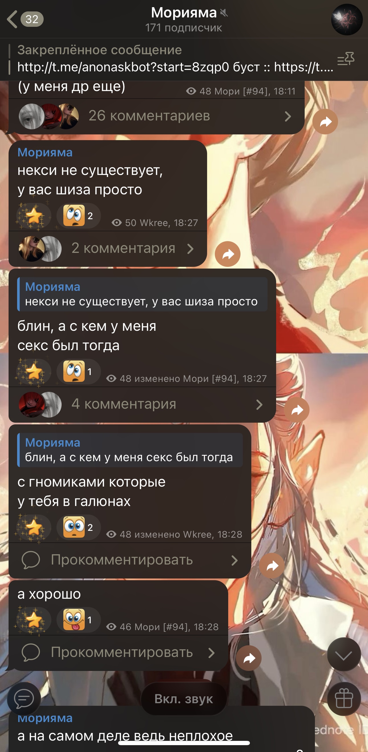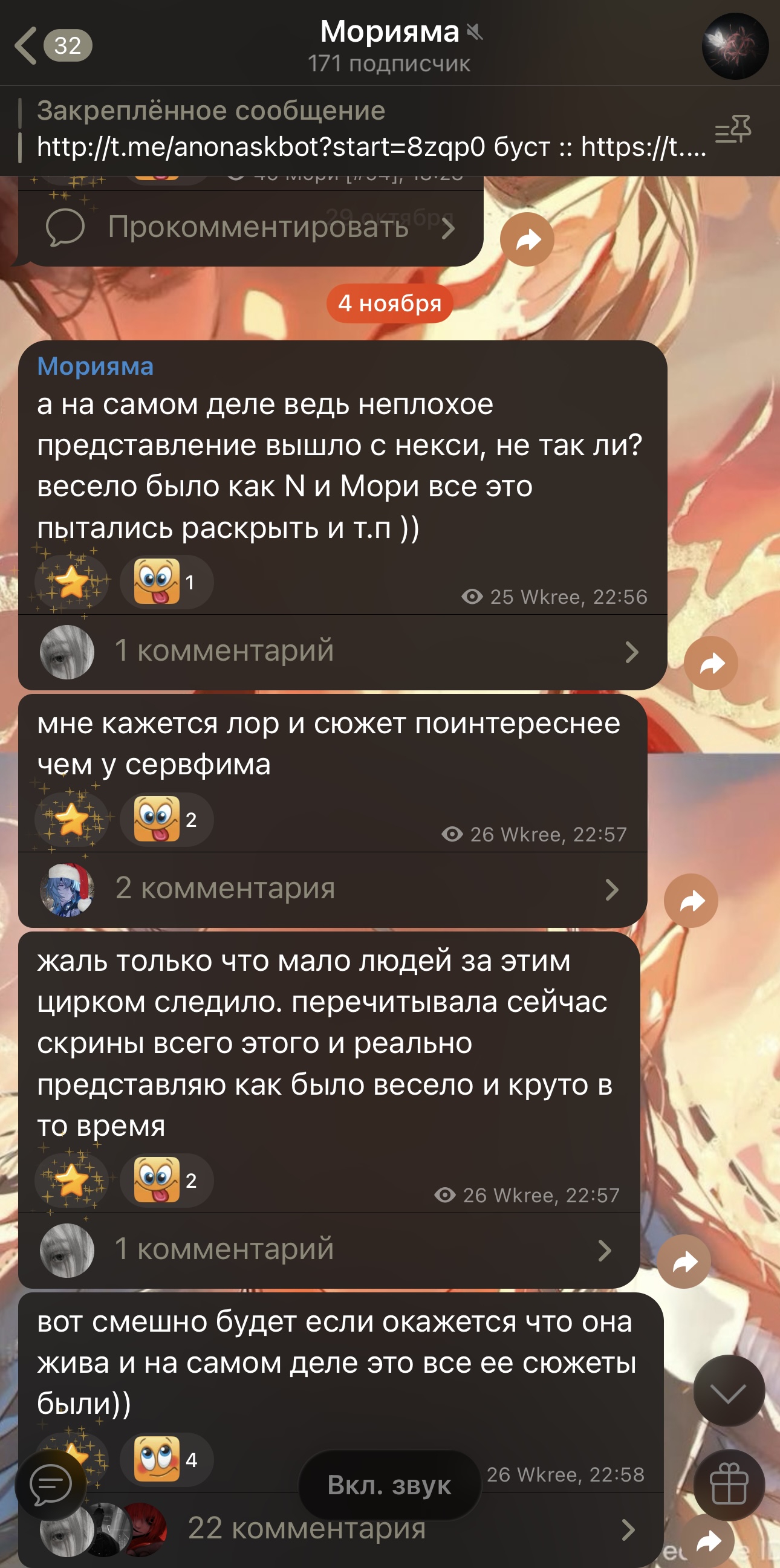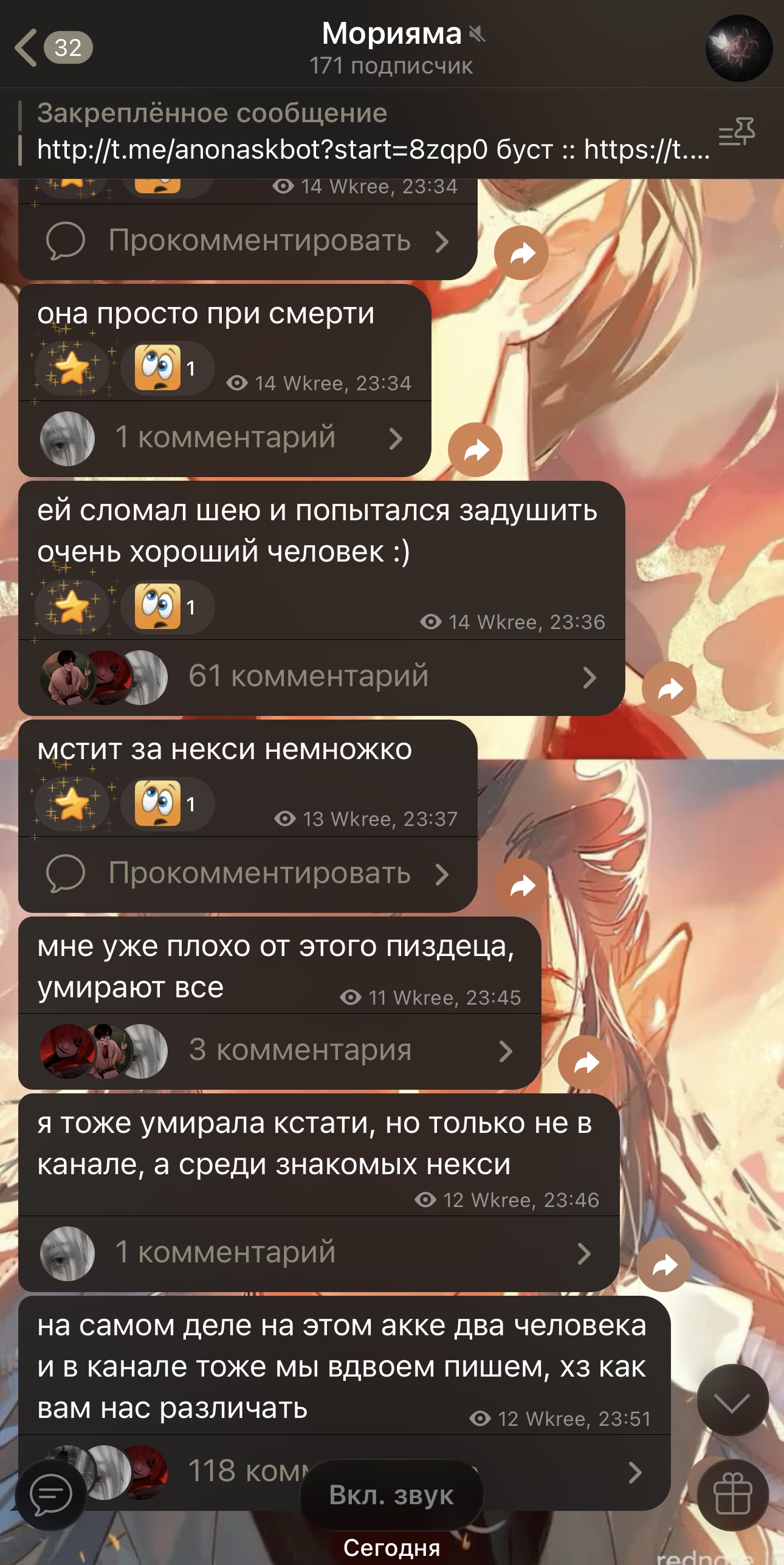 недавно я наткнулся на оч странную историю. максимально случайно встретил на просторах тг некую некси. она предложила вступить мне в флуд ну а мне было нехуй делать и вступил. у нее почему то были плохие взаимоотношения практически со всеми но я старался ее защищать и поддерживать. тот флуд потом она удалила и создала новый и и потом еще раз и так с каждым флудом. я с ней маленько пообщался в лс. поо ее словам жила в праге с бабушкой которая ее якобы била. ей где то 14-17 лет. родом из беларусии и какое то время жила на украине и есть какие то родственники рф. она как то приезжала в питер и я предлагал ей погулять. она сначала согласилась но потом слилась потому что типо появились какие то планы ее родственников. потом я потерял с ней контакт. остался только ее тгк который в настоящее время называется морияма. через сколько то недель она выкатывает огромный прощальный пост. она якобы совершает суицид. якобы потому что кроме галимых постов в тг у меня больше ниче нет. сейчас ее канал якобы ведут 4 человека: мори, не мори, не мори 2 и N. в принципе туда щас какие то оч странные посты постят ч вообще хз че думать я знаю что это выглядит как будто это я еблан и повелся на какую то залупный интернет байт, но я все равно хочу знать об этом побольше если че могу найти еще че нить что есть у меня на эту тему если вам надо