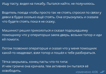 >>221357 буквально ввел это: история про то Машинист решил приколоться и сказал подошедшему помощнику что у операторши заела дверь, возьми топор и иди ей помоги. Потом позвонил операторше и сказал что у меня помощник какой-то неадекват, взял топор и пошёл к тебе разбираться.