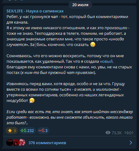 Чат был привязан к каналу @sapiscience. У него тоже есть комменты, среди сотен членов встречаются нищие фотки красивых женщин: https://t.me/sapiscience_chat.
