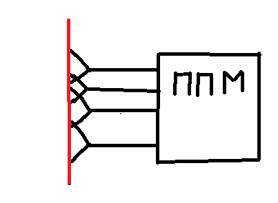 Как распространяется радиосигнал именно от антенн? Конкретно интересует с помощью чего и в следствие чего происходит направленный сигнал. То есть при обычной передаче волна пойдёт перпендикулярно красной черте, но с помощью какого-то определённого модуля сигнал, подающийся на одну из антенн, замедлится(пойдёт по более длинному пути в ППМ, из-за чего отправится позже), самая нижняя антенна отправляет волну сразу, выше отправляет чуть позже и так далее до самой верхней. Получается, что сигнал пойдёт уже не перпендикулярно красной черте, а под каким-либо углом. Но с помощью какого модуля происходит это замедление и как сигнал идёт под углом, если он всего лишь отправляется с задержкой?
