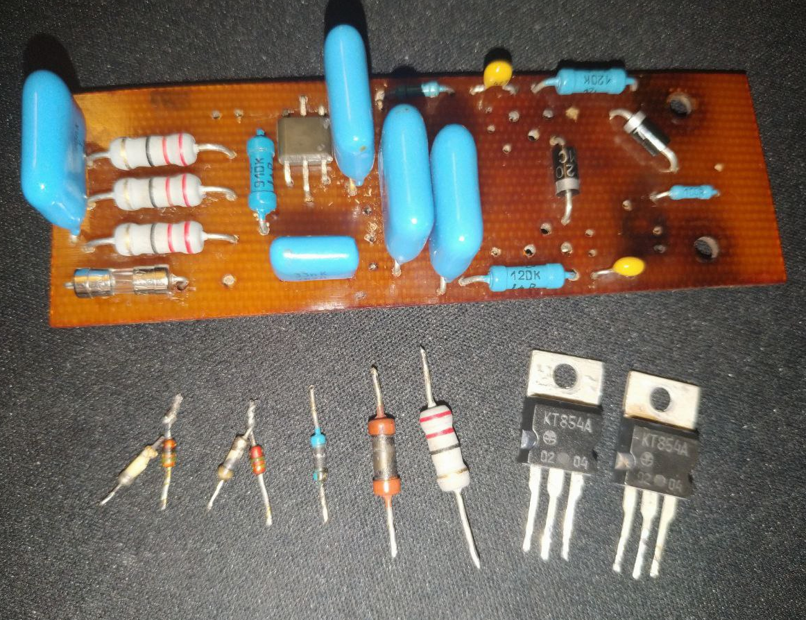 Так-то в принципе ничего прям редкого вроде не сгорело, транзистор один и резисторов кучка с диодом. Но проблема в том, что погорело так, что не отличить где какой был резистор. Как быть? Схемы такой редкой хуйни не найти в интернете, а мой уровень познания в радиотехнике не позволяет на глаз примерно понять че где было.