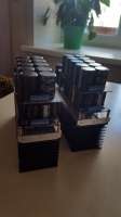 >>107323 Модуль уселка на КП904 в мостовом включении (старая схема из "Радио" на новый лад, на современных деталях, за исключением собственно КП904). У них стрёмный корпус, поэтому пришлось городить такой своеобразный конструктив, чтобы крепить транзисторы в нужном положении к плите гайкой, закрывать гайки радиаторами (охладители для тиристоров) и крепить сверху платы (снизу сам уселок, сверху БП для выходного каскада).