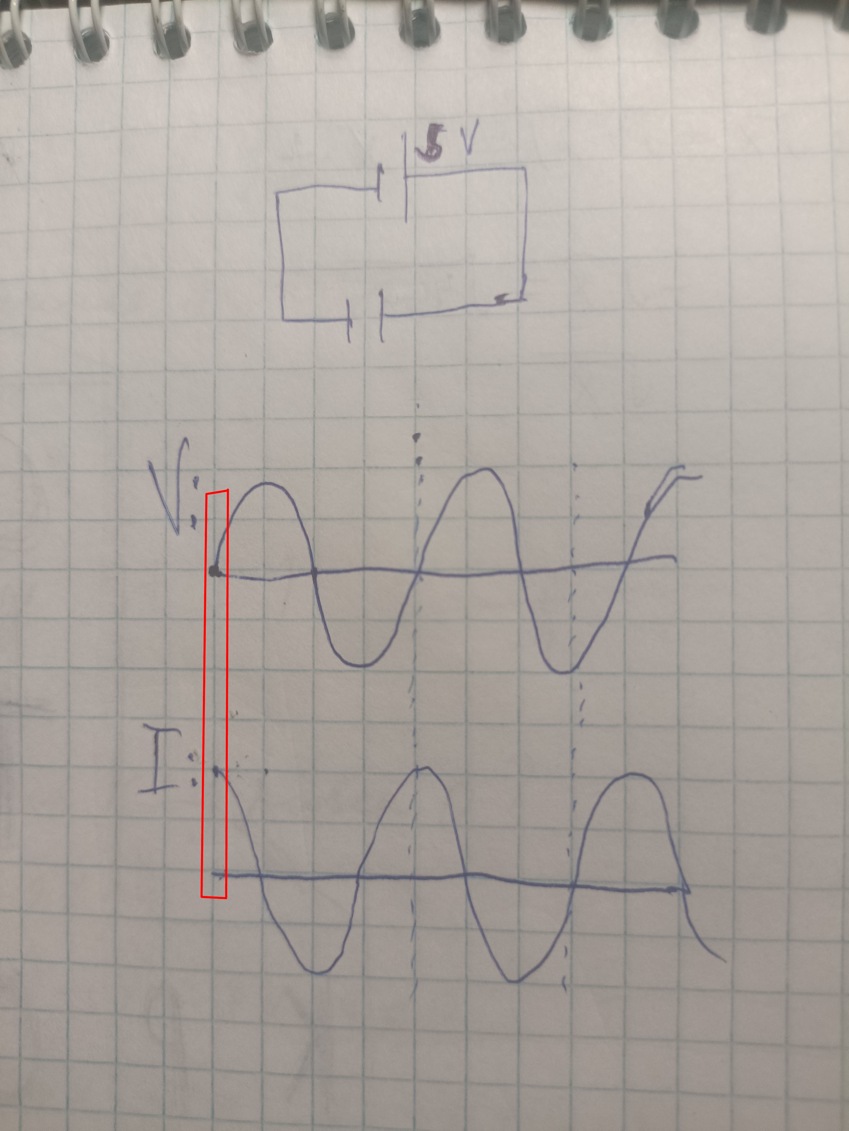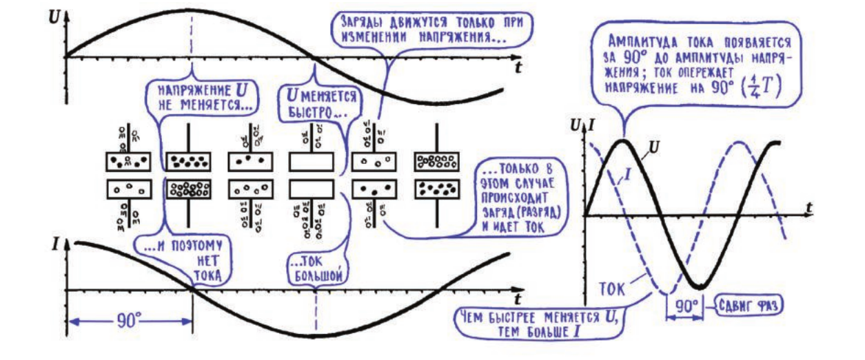 короче я уже очень долго думаю над этим вопросом и никак не могу понять. пришел к выводу что сила тока зависит не от напряжения, а от производной напряжения. хоть и это звучит довольно странно. вижу я это вот так: на пике напряжения конденсатор заряжен максимально и емкостное сопротивление велико. значит на пике напряжения ток отсутствует. когда напряжение равно 0, ток течет максимально, так как емкостного сопротивления нет. но понять я не могу одной вещи. если напряжение равно 0, то есть ЭДС нету, то как ток может течь? при ЭДС равном 0 нет никакой силы которая бы заставила электроны толкать следующие