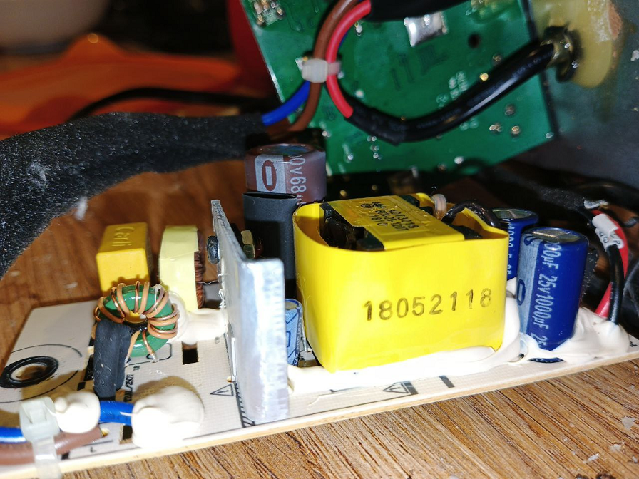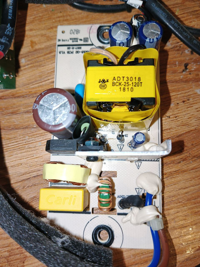 Есть такой вот блок питания, на выходе которого 0 после отключения света уебал бы всех этих электриков от жкх; будем надеяться, что плату устройства он защитил На входе 230 нормально. Предохранителя не вижу. Из конденсаторов только один синий выглядит слегка горбатым, иногда такие еще сто лет работают. Остальные визуально в порядке. В отключенном от сети состоянии бахнул меня током до ожога на пальце.