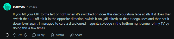 Короче, хуй с этими полосками. Обнаружилась другая проблема. В верхнем левом углу красный цвет уходит в фиолетовый. Нагуглил такое https://www.reddit.com/r/crtgaming/comments/b9q9ac/purple_discolouration_in_one_corner_only/ Действительно, если перевернуть телек набок, то цвета становятся нормальными, но добиться постоянного эффекта мне не удалось. Хотя под постом куча благодарок. Я даже в теории не понимаю каким образом это должно было помочь.