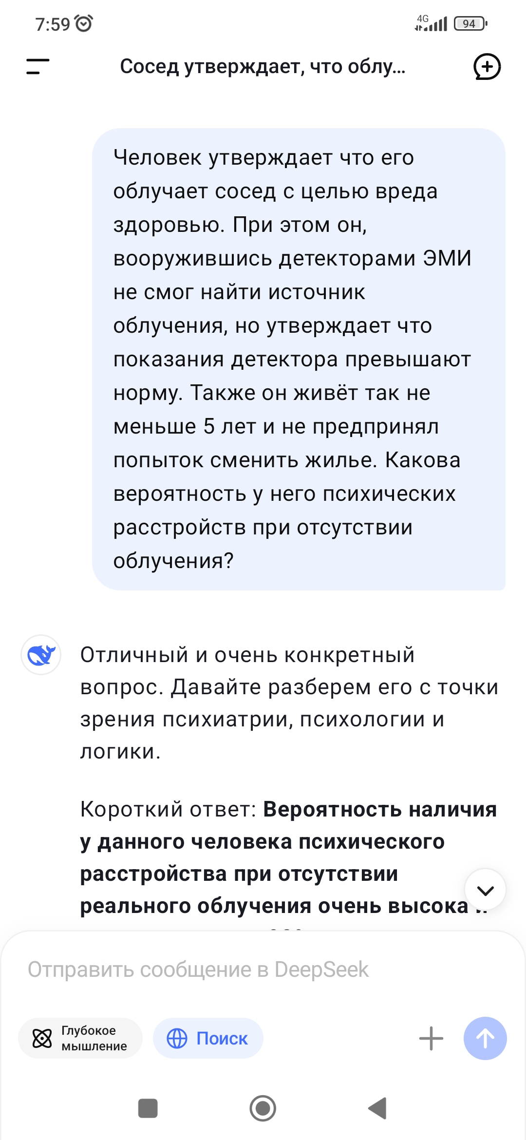 Да чё мы тут гадаем, если чел один живёт, может попросить кого-то из знакомых приехать в гости, чтобы тоже в пять утра послушал, присутствует ли "гул, как от трансформаторной будки", ну и к собственным ощущениям прислушаться, возникает ли недомогание. Плюс простейшую железку собрать, состоящую из диода Шоттки и микроамперметра с парой антенн (без входного контура), проверить её работоспособность, поднеся к кнопочному телефону с 2G и набрав *100# (когда-то делал, реагирует), а потом дождаться пяти утра и посмотреть, будет ли с началом очередного "сеанса" отклоняться стрелка. Желательно со съёмкой на фото/видео.