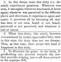 >>512680>>512681Вчера чёт забыл, исправляюсь. Прашна-упанишада, четвёртый "воспрос", пункты 5-7. Во сне без снов разум отдыхает в Self/Атмане (у разных переводчиков тут по-разному, но по таблицам это синонимы, так что не суть).На пике фрагмент (это нормальный перевод, а не тот не очень точный). В русском переводе Сыркина так:>5. Здесь во сне этот бог ощущает величие. Он снова видит все, что было видано; снова слышит все, что было слышано; снова и снова переживает то, что было пережито во [всех] местах и странах света. И виданное, и невиданное, и слышанное, и неслышанное, и пережитое, и непережитое, и сущее, и не-сущее – все он видит; будучи всем, он видит.>6. Когда он бывает охвачен жаром, то этот бог не видит здесь снов. Тогда в этом теле бывает это счастье.>7. Подобно тому, дорогой, как птицы собираются на дереве – [своем] жилье, Так же, поистине, и все это собирается в высшем Атмане:Ниже в комментариях Шанкара 710 поясняет, что всё исчисляемое возвращается в Self. Также упоминания в том же ключе нашёл в Чхандогья-упанишаде и в Брихадараньяка-упанишаде. В последней отмечается, что в состоянии сна без снов ты свободен от всех желаний.