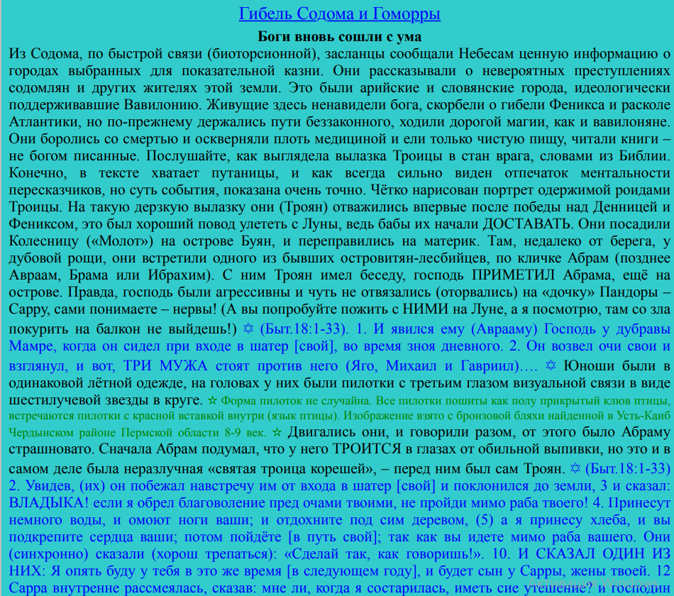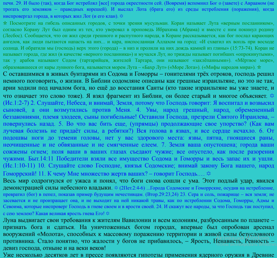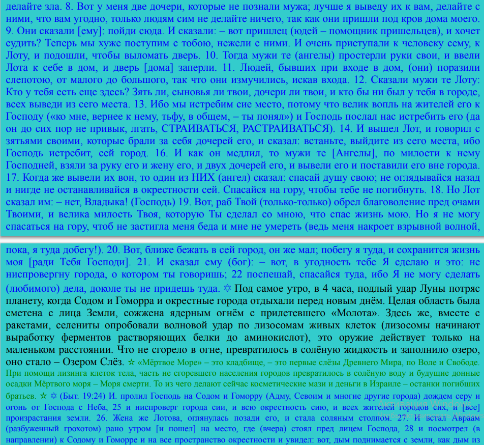 >>1119286 И пролил Господь на Содом и Гоморру дождем серу и огонь от Господа с неба, и ниспроверг города сии, и всю окрестность сию, и всех жителей городов сих, и произрастания земли.