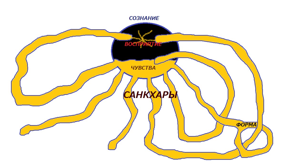 Но из-за того что сознание изображено в виде пространства, то из этого может возникнуть действительно адвайтический взгляд - сознание-центричности. То есть, то что на второй картинке - это так лишь ощущается в сравнении с первой, но на самом деле сознание не выходит за рамки восприятия и привязано к его объектам, к контакту.