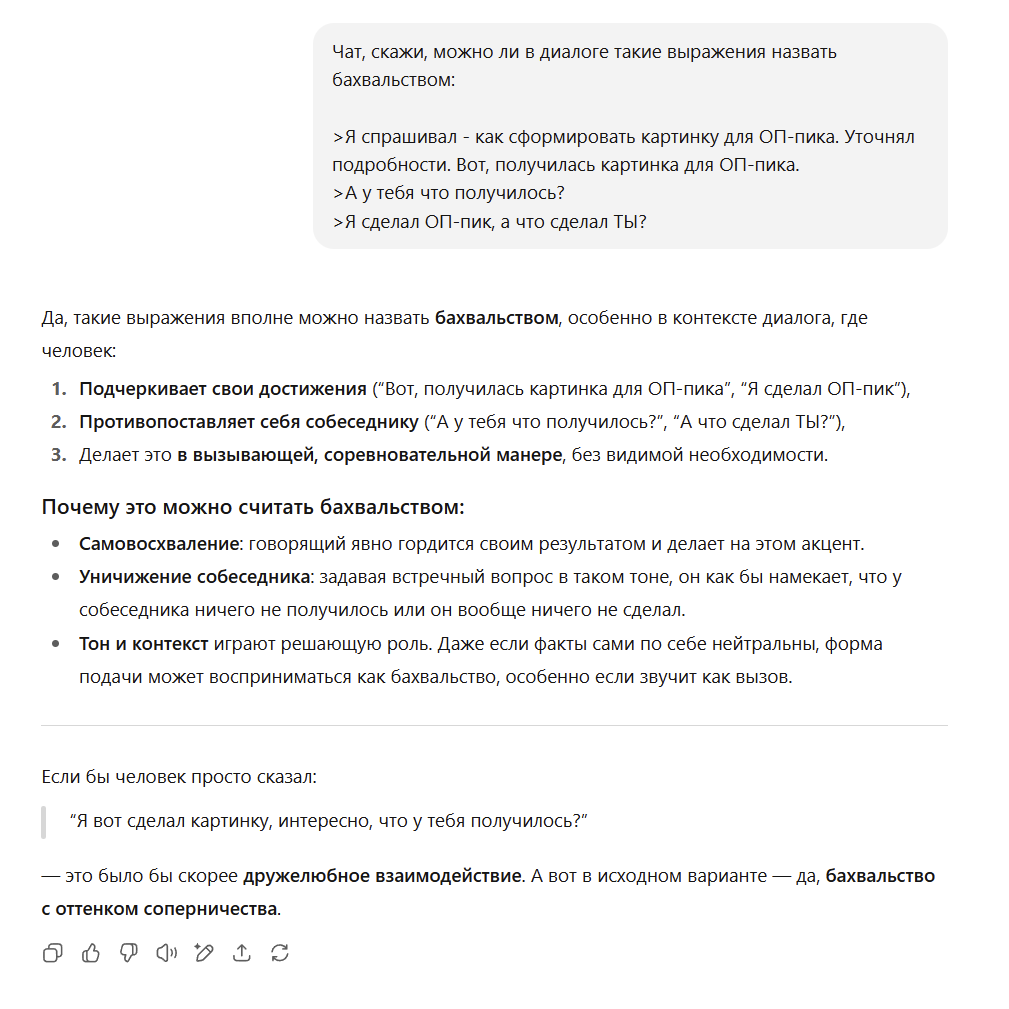 Все это ваши защитные реакции. Потому что когда человек знаешь, от просто пишет на ;сколько будет 2+2?" - ответ "4", а не "самонадеянно так говорить")