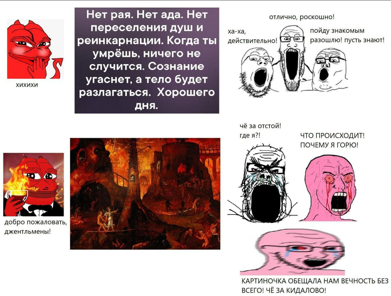 >>1148746 Я нифига не понял что Мрачный Жнец говорит этим мемом. Думаете это повод ещё разок посетить кладбище? Все дороги ведут не в Рим, все дороги ведут на кладбище. Смерть это крепкая вера, в смерти можно быть уверенным. Мрачный Жнец не обманет сказав, что вера в смерть одна вер в которую легче всего поверить, и она же весьма правдивая, истинная вера..