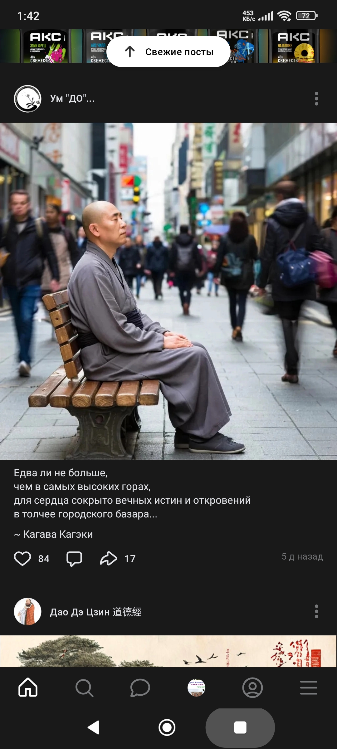>>1146473 Если ты захвачен страстями, будешь видеть волны даже на поверхности замёрзшего пруда и не обретёшь покоя даже в тишине горного леса. Если ты взрастил в себе пустоту, удушливая жара будет веять тебе прохладой, и ты не будешь слышать шума, даже стоя посреди оживлённого рынка.