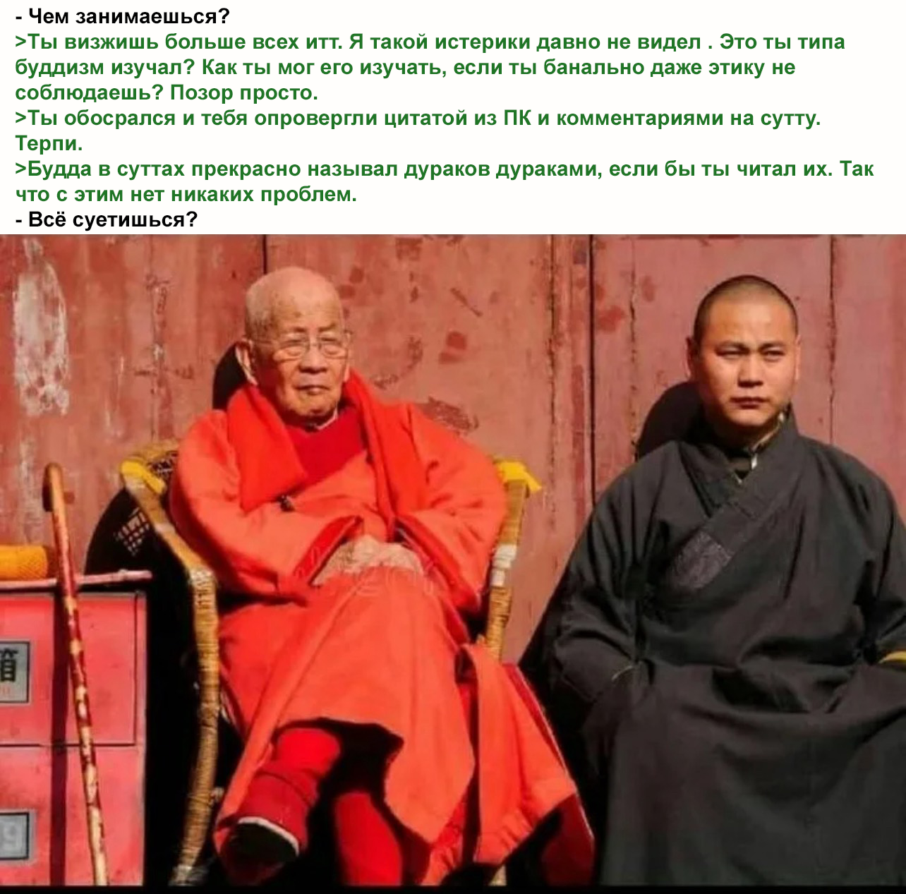 >Меня тут как раз обоссывали что я даю выпуск праведному гневу на "больных и придурков" и что я нарушаю метту в ответ на реально ебланское поведение окружающих. Почему тогда будда призывал стендов с раскалёнными иглами для защиты ценностей дхармы, а мне нельзя? Потому что они питаются вниманием. Они будут говорить что угодно в ответ, лишь бы противоположное. Они жалкие чмошники. Вот сидят коупят, типа троллят.