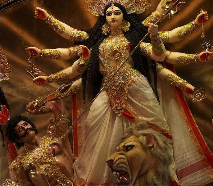 Дурга победительница интенциональных асуров считающих что слово творит мир. Махиша бык-асура — это грубая привязанность ума к форме, инерция буквы, мания буквального. Дурга побеждает его, когда отбрасывает оружие ума и убивает его трезубцем видения — соединяя три аспекта слово-действие-знание в одно. Шумбха и Нишумбха — это пара самодовлеющих логосов: один хочет властвовать над истиной, другой — подтверждать её зеркалом ума. Дурга побеждает их смехом, то есть вибрацией, где звук перестаёт обозначать и становится светом. Все деваты отдают ей свои шакти, это не поклонение, а размагничивание. Они возвращают Дурге свои имена и функции — Вайю дыхание, Агни огонь, Индра молния, Митра связь. То есть язык богов возвращает источник звука самой Матери, и намерение перестаёт быть частным, становится потоком. Так Дурга растворяет интенционализм не борьбой, а снятием частных имен в пользу целостного звучания