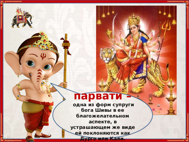 >>1159126 Нет. Парвати хотела себе сына и слепила Ганешу для себя. Ганеша был с человеческой головой. Шива в то время находился в другом месте. Однажды она пошла одна купаться в бане, и Ганеша остался охранять вход. Внезапно вернулся Шива и хотел пройти к Парвати, но Ганеша ему воспрепятствовал. Шива разгневался, начался поединок. Шива отрубил Ганеше голову. Парвати вышла из бани и увидела мертвого сына и Шиву. Она была мягко скажем не рада и потребовала от Шивы воскресить сына. Шива приказал своим слугам отправиться в джунгли и отрубить голову первому попавшемуся животному. Первым попавшимся животным оказался слон. Слуги принесли голову слона Шиве, и он заменил Ганеше его голову на голову слона и заодно воскресил