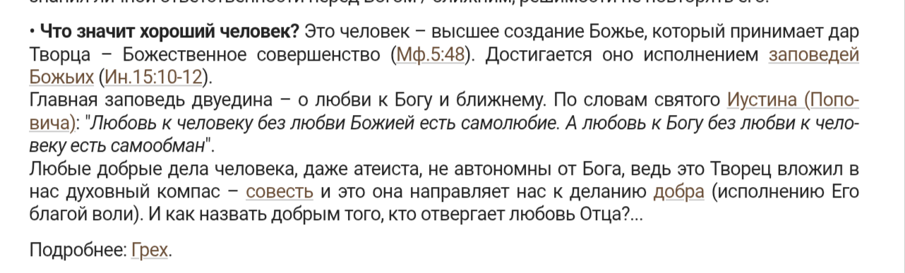 > читай отцов церкви Так я выше буквано кинул с азбуки веры скрин, что еще надо читать > Любовь к человеку без любви Божией есть самолюбие. А любовь к Богу без любви к человеку есть самообман это опять же оттуда, тут четко видно что дела и вера раздельные вещи и могут быть независимы друг от друга в людях