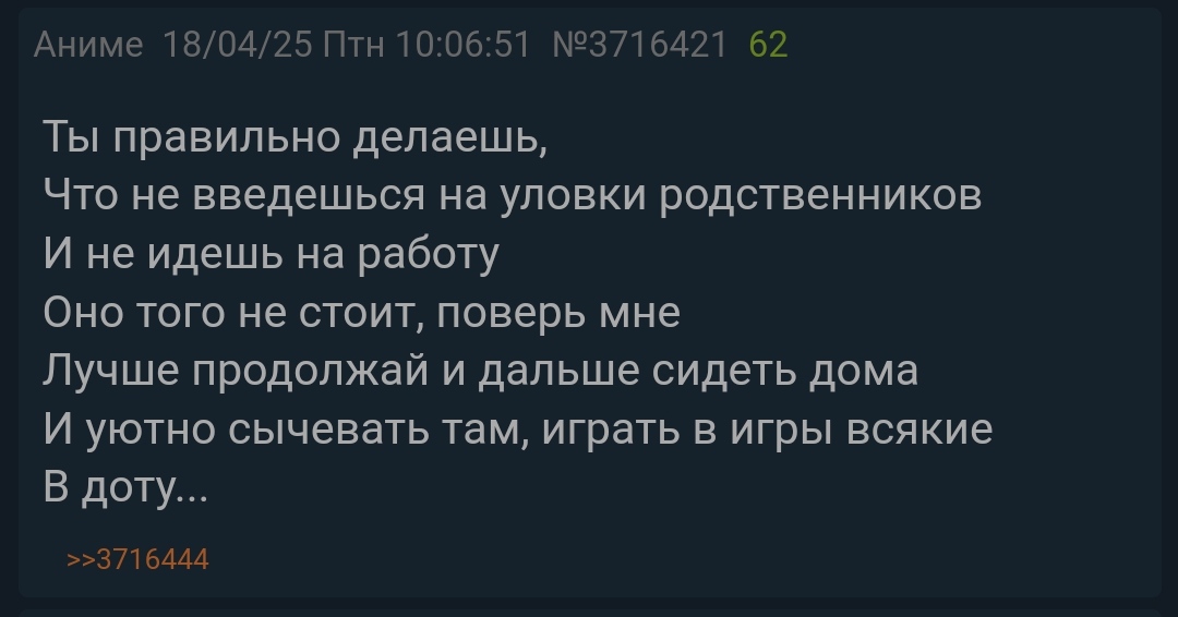 >>5506778 да тоже недумаю совсем о будущем оно меня пугает очень просто утыкаюся в монитор и с утра до вечера так чтоб не сталкиватися с реальность врядли какието таблетки помогут ничего уже непоможет просто бегство от реальности точно такоеже посути как и с постояным утыканием в комп много всякого постил неприятного впервую очередь свои наивные мысли и чувства несколко лет назад жёстко меня потом засрали досихпор вспоминаю примерно то же самое писал но не в том месте.. >>5506781 ну добрый пьяный пишущий стыдные вещи.. страшно представити как бы на меня огненая вода бы повлияла учитывая что даже так могу глупость написати