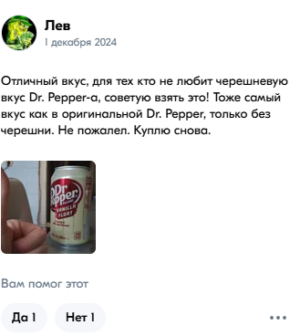 его еще выбирать там надо какойто Нет желания этим заниматься > Там от др. пеппера только одно название. Ну попробую тогда оригинальный закажу поищу Если он и правда окажется вкусным будет славно То что попробовал вишневая водичка