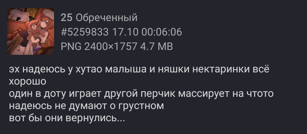 >кто покинул это место и больше не возвращался (при условии что они не померли или не стали нормисами жена-завод-детишки) Таких тут буквально 0 было за всё время. И всё логично, если ты не нормис, то тебе больше негде сидеть и некуда идти, ты возвращаешься сюда. Или на мелкоборды в аватаркочатики, но это то же самое что и ЭТО МЕСТО.