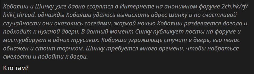 >>5552974 они не показывали никакой социальной активности и не постили ничего компрометирующего, уличающего в социальной адаптации в момент моего пребывания в тредах, кроме титока с его заводом. Он бывал выкатывал пасты о своем затворничестве и ощущениях,и испытываемых при этом эмоциях. Спустя время начинал писать обратное будто бы разделясь на две личности. Вот пост Раздетого хорошо описал взгляд со стороны и всю трансформацию >>5552070 →>>5552074 → После случая с Никитиной травлей и тем "безобидным" чб курьером который оказался бухгалтером внезапна, я разочаровался в своих ожиданиях и положительных характеристиках анонимов. В рф заходят довольно разные личности и до поры до времени никак себя не раскрывают, пока не заденут их эго.
