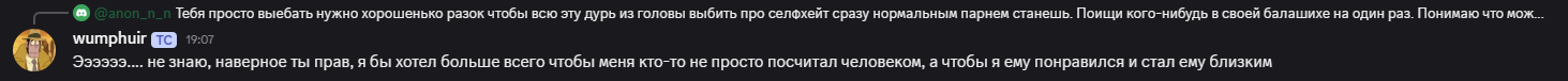 >>5555442 официальный двач-сервер, ссылка есть в /d/, он там создал топик, где жалуется что его слишком надолго отправили на отдых, а прямо сейчас в том же топике никитке предлагают стать содержанкой или поискать парня на один раз, говорят что его нужно оттрахать, чтобы он перестал комплексовать. при этом он там называет себя трушным хиккой. просто троллинг тупостью и издевательство над настоящими хиккам