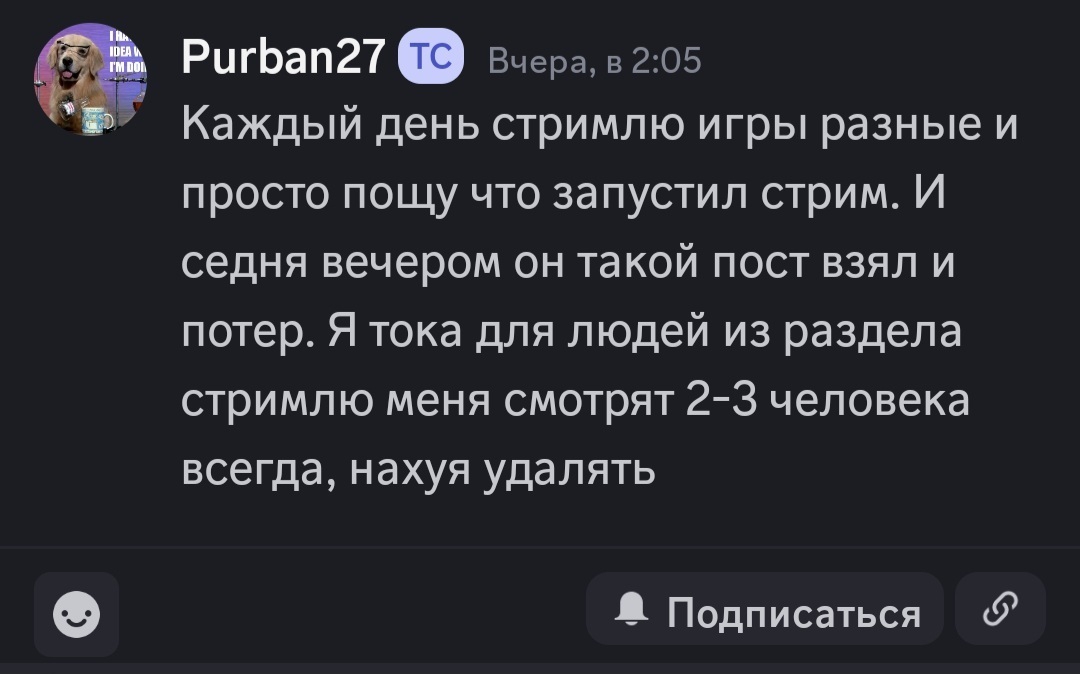 >>5558975 Ну я не видел ничего этого где он такое утверждал. У меня тоже дискорд есть и давно. Раньше я сидел во многих каналах, в том числе конфах, но больше по nsfw каналам. Сначала я думал что буду общаться, но вот что то не начал. в один день отовсюду удалился так как всё равно не сидел и не общался нигде и каналы только место занимали и уведомлениями отвлекали, и оставил только два канала - fugtrup для его артов, и по моему любимому музыканту для новостей о новых релизах.