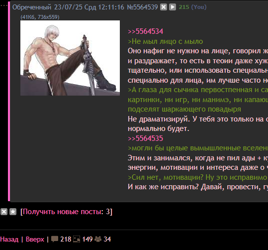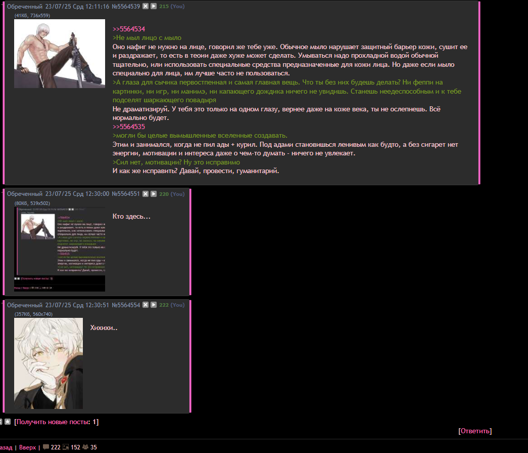 >>5564534 >Не мыл лицо с мыло Оно нафиг не нужно на лице, говорил же тебе уже. Обычное мыло нарушает защитный барьер кожи, сушит ее и раздражает, то есть в теоии даже хуже может сделать. Умываться надо прохладной водой обычной тщательно, или использовать специальные средства предназначенные для кожи лица. Но даже если мыло специально для лица, им лучше часто не пользоваться. >А глаза для сычика первостпенная и самая главная вещь. Что ты без них будешь делать? Ни феппи на картинки, ни игр, ни манимэ, ни капающего дождика ничего не увидишь. Станешь неедеспособным и к тебе подселят шаркающего повадыря Не драматизируй. У тебя это только на одном глазу, вернее даже на коже века, ты не ослепнешь. Всё нормально будет. >>5564535 >могли бы целые вымышленные вселенные создавать. Этим и занимался, когда не пил ады + курил. Под адами становишься ленивым как будто, а без сигарет нет энергии, мотивации и интереса даже о чем-то думать - ничего не увлекает. >Сил нет, мотивации? Ну это исправимо И как же исправить? Давай, провести, гуманитарий.