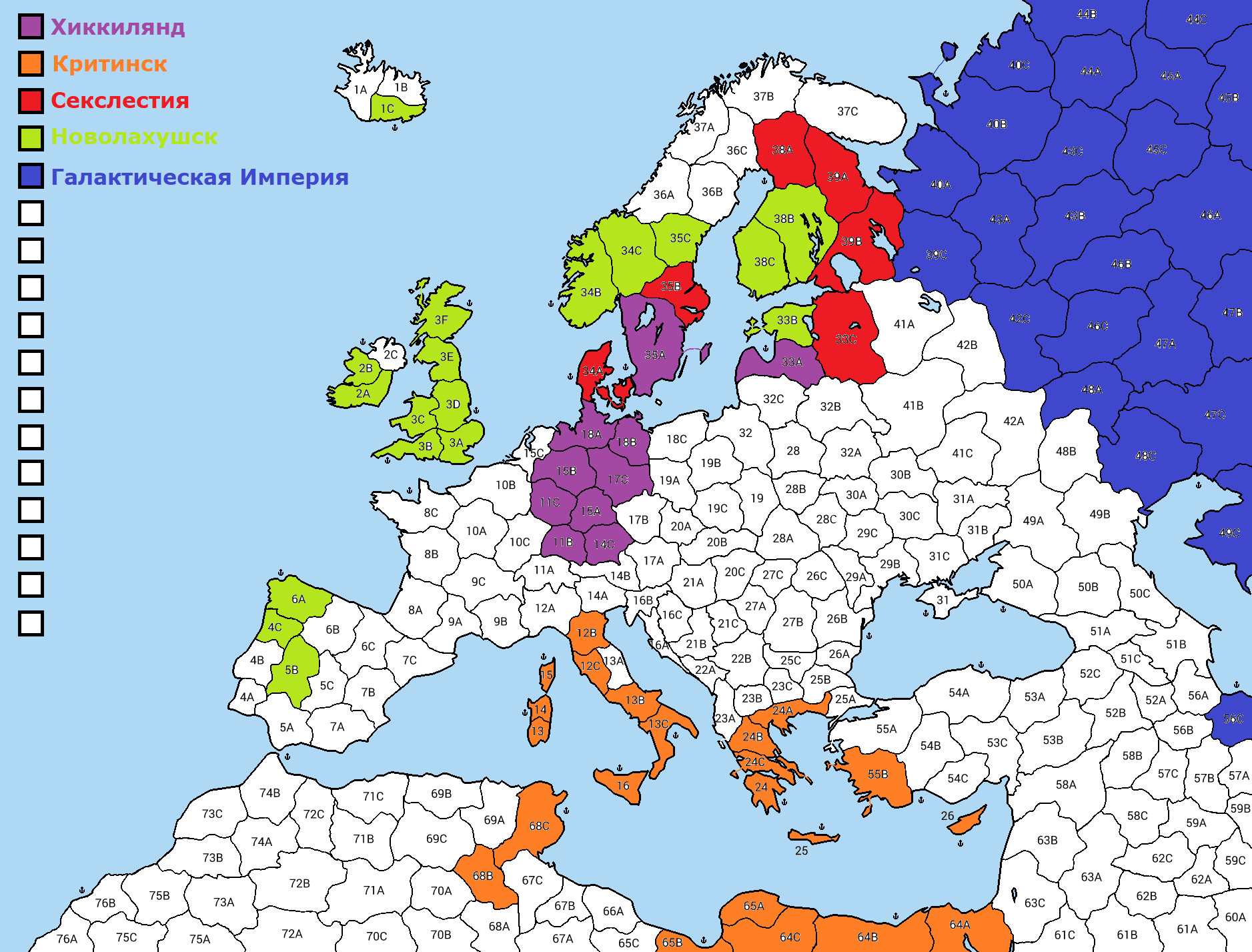 /zet/ ЗАХВАТИ ЕВРОПУ ТРЕД ПОШАГОВЫЙ ПРАВИЛА: 0) Игра начинается после создания минимум 3 стран. 1) Государства создаются бесплатно. Можно назваться своею аватаркою-правителем. 2) При создании государства обязательно жирным указывайте название, стартовую территорию и цвет (черный, белый и моря – запрещен). 3) Государство создается с одной территорией. Новое государство начинает роллить со следующего хода. 4) Захваты территории проводятся при помощи броска кубика ## 5d9 ## (без пробелов). Последняя цифра показывает количество захваченных территорий. 1–3 = 1, 4–6 = 2, 7–9 = 3, 0 = 0. 5) Присутствуют бонусы к захватам. Дабл — +2, Даблодабл — +3, Трипл — + 4, Квадра — + 6 территорий, даблотрипл\триплодабл — +5, пента — +12 к количеству захваченных территорий. 6) 666 — ЯО. Превращает 10 территорий противника в нейтральные. 7) 777 — защита от ЯО. 8) Обязательно выделяйте свой ход жирным. На выбор ОПа ничего не рисуется, пишите номера клеток. 9) Не ролльте жирным. 10) При выполнении любых действий пишите название страны, за которую играете. В противном случае ОП не обязан ничего учитывать. 11) Обязательно использовать жирный для выделения выпавших вам бонусов, действий, обращений к ОПу. 12) ОП обращает внимание только на жирный шрифт. 13) Из порта можно захватить другой порт. 14) Дипломатия существует. Вы можете создавать конфедерации, альянсы, заключать мир и много ещё чего, всё ограничивается вашею фантазиею. 15) Без столиц и укреплений. Восстаний нет. Накапливать даблы запрещено. 16) Последний ход около 500-го поста. После 500-го перекат в другой тред. 17) Передавать часть территорий можно. 18) Нельзя создать государство впритык к другому государству за исключением случаев отсутствия свободных территорий. 19) Передавать роллы нельзя. 20) Если выпал 0, сообщайте об этом. 21) Если уходите, то сообщите об этом, уважайте остальных.