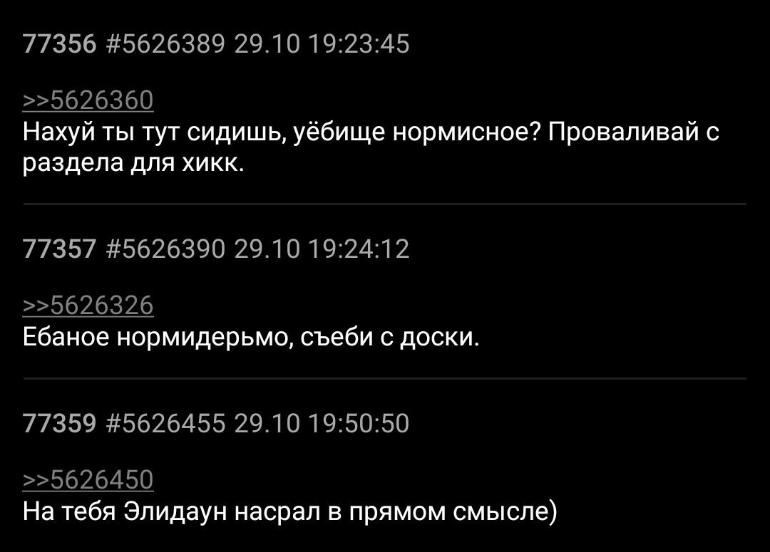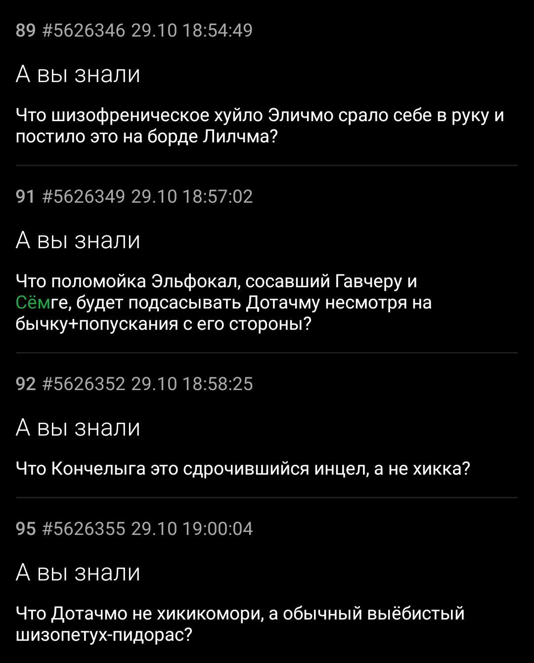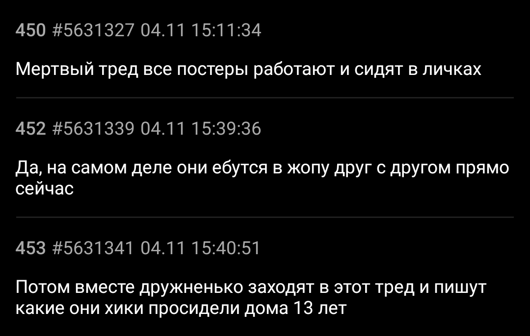 >>5651152 >>5651159 >>5651162 Какая же тряска у Дилда, что он аж в РАБочее время зашел на борду, откуда его пидорнули, дав жесткого пинка под зад, как ебунявой собаке, ибо ему там не место, и подолгу ищет мои посты, чтобы "обосрать" меня) Типичная социоблядь)