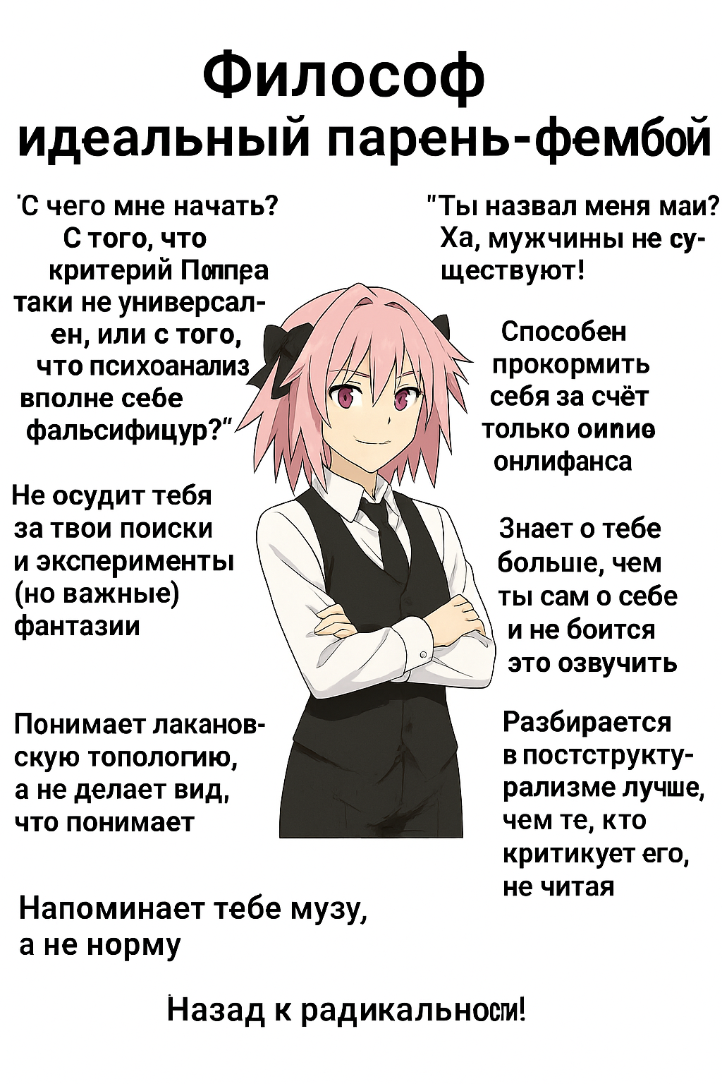 В этом смысле фембой действительно является радикальным субъектом — не потому, что он стремится разрушить мир, а потому, что своим существованием он делает видимым то, что раньше оставалось невидимым: свободу быть собой вне пределов бинарных категорий.