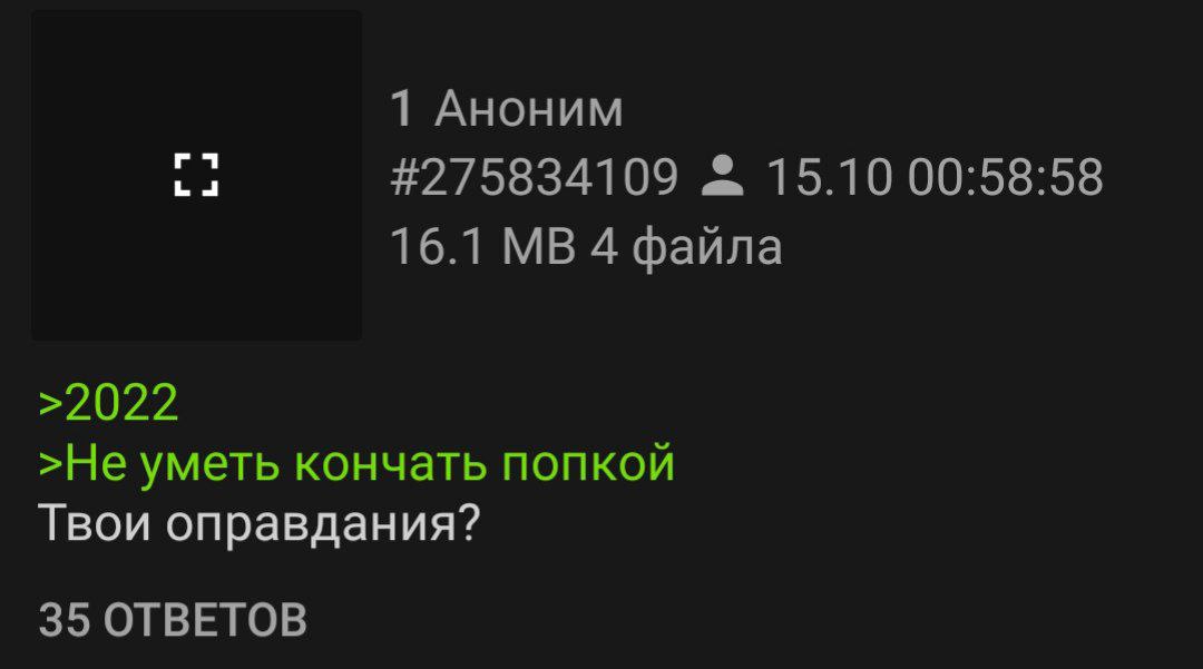 >>5588338 Представил как тебе жопу печет, мало того что на аргументы оскорблениями отвечаешь, так еще и сидишь ф5 дрочишь чтобы побыстрее ответ наклепать и последнее слово за собой оставить.